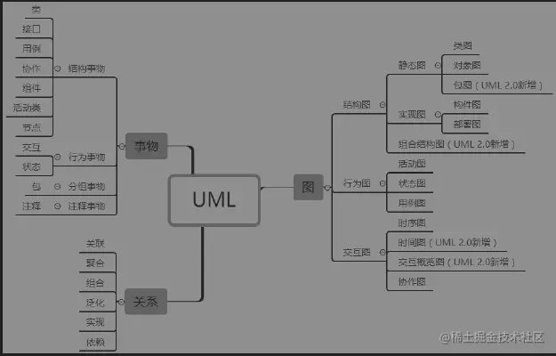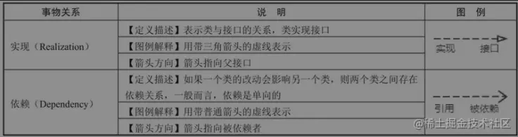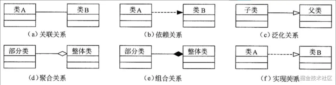 关系用于表示基本图示符号之间的关系,主要有关联、依赖、泛化、实现。