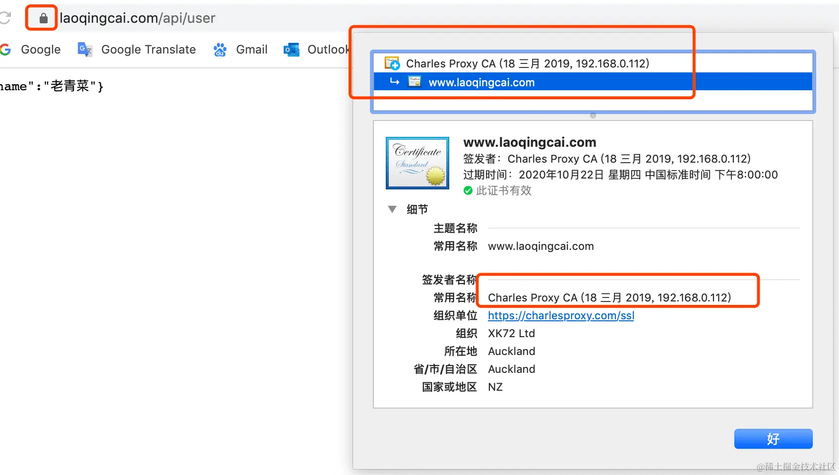 以Charles为例,我们看一下 HTTPS 中实际中间人攻击的流程。启动Wireshark、Charles,设置Charles监听端口,接着设置手机Wifi代理,然后我们打开手机浏览器,访问 www.laoqingcai-已注销.com/api/user 。