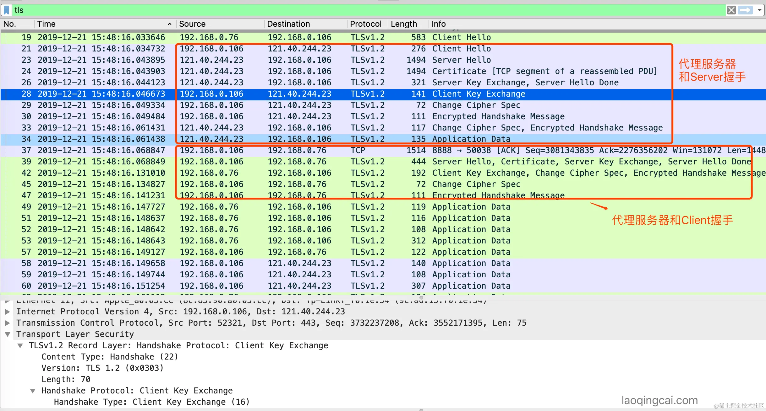 接着观察Wireshark(这里为了过滤无用的包,我加了 tls 过滤条件),最终结果如下图: