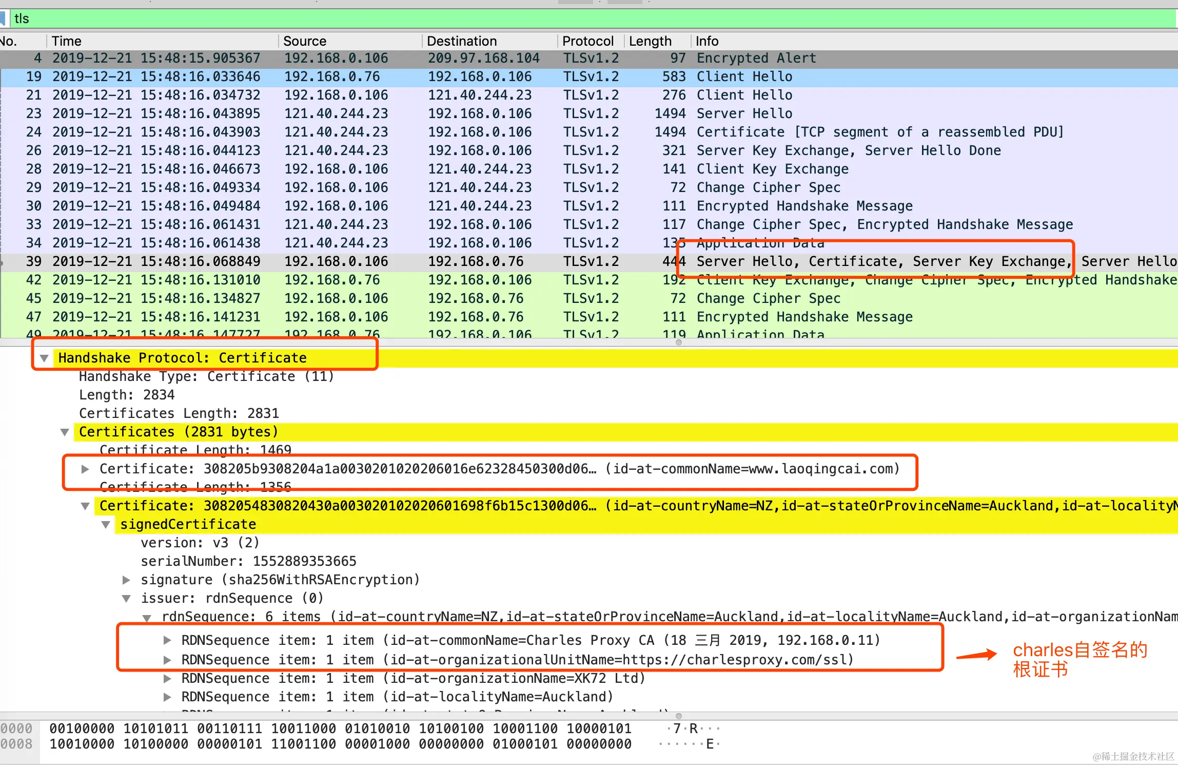 很明显,Charles扮演了中间人身份,和 Client、Server 都维持了会话。针对 Server,扮演了 Client,正常握手;针对 Client,扮演了 Server,使用自签名根证书,伪造 Server 证书,进行握手。