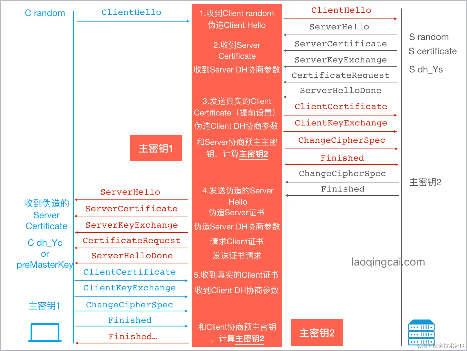DH协商参数;到第33条,完成握手,互发Finished验证主密钥。这时候中间人和 Server 都已经计算出这次会话的主密钥1。 -