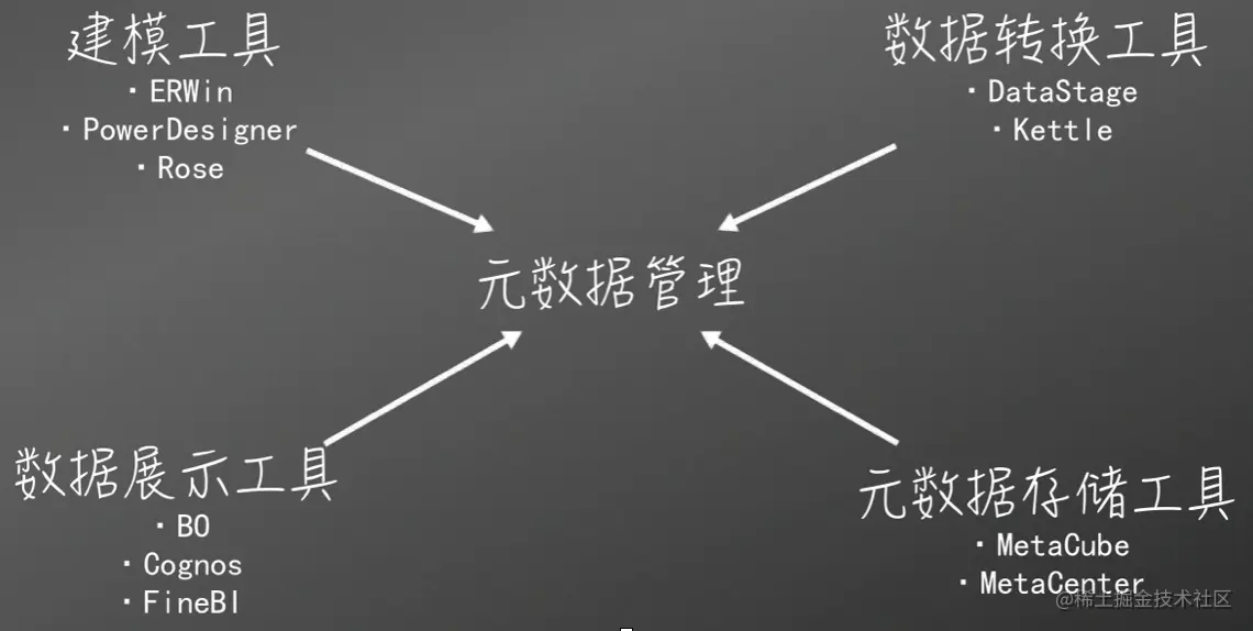 如图所示,与元数据相关的数据仓库工具大致可分为四类:
