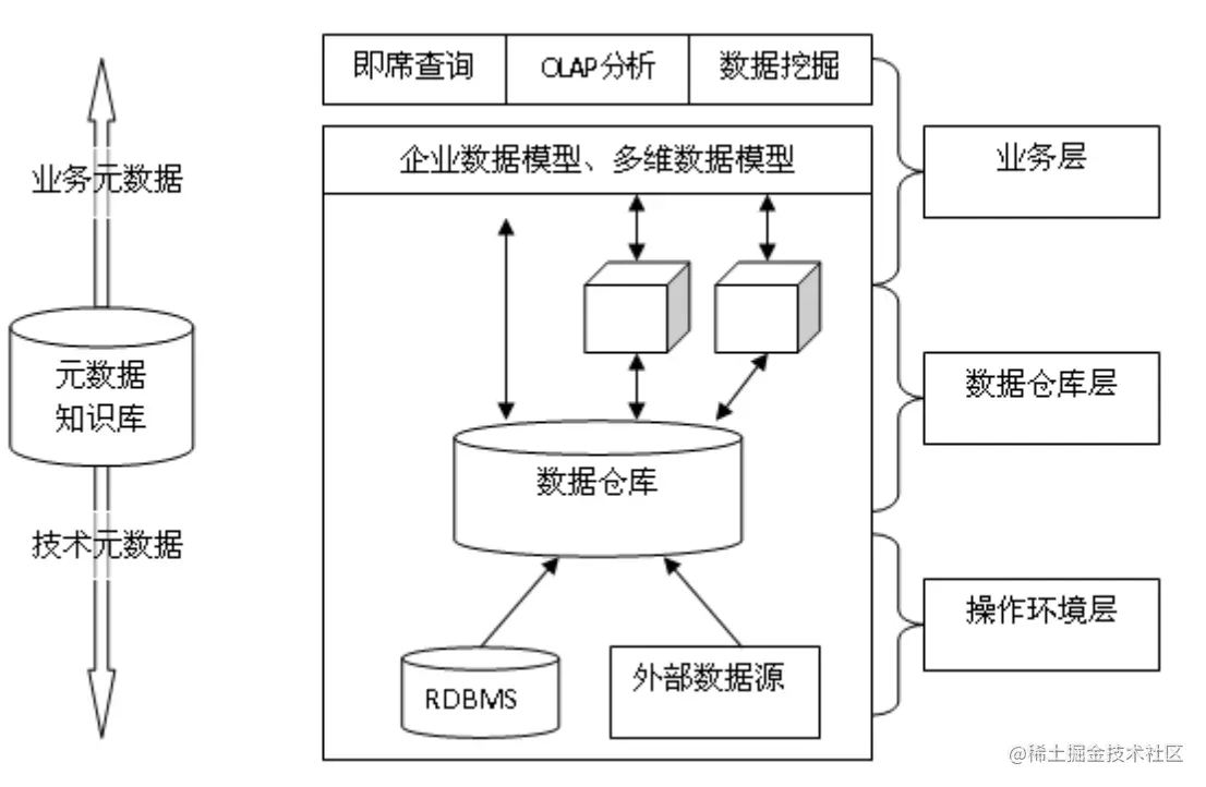 其中,第一层(操作环境层)是指整个企业内有关业务的OLTP系统和一些外部数据源;第二层是通过把第一层的相关数据抽取到一个中心区而组成的数据仓库层;第三层是为了完成对业务数据的分析而由各种工具组成的业务层。图中左边的部分是元数据管理,它起到了承上启下的作用,具体体现在以下几个方面: