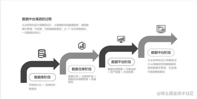 从数据处理的维度来聊一聊数据中台经历的四个阶段:数据库阶段、数据仓库阶段、数据平台阶段、数据中台阶段。