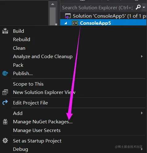 使用 NuGet Package Manager 是安装 log4net 最简单也是最快速的方式,假设你已经在 Visual Studio 中创建了一个 Console Application 项目,你可以通过 Nuget Manager 按照下面的步骤一步一步的进行安装。