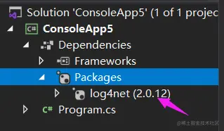 到目前为止,最新的 log4net 版本是 2.0.12,稍等片刻你会在 NuGet Package Manager 中观察到 log4net 已经成功安装,同时你应该可以观察到 log4net 已成功添加到 project项目的 引用列表中了,如下图: