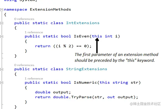 请注意扩展方法中的第一个参数,正如之前讨论过的,任何扩展方法都必须是静态的,而且在参数之前还要申明一下 this 关键词,比如像上面这个例子一样,相当于告诉了编译器你已经在 string 类上扩展了一个 IsNumeric 方法。