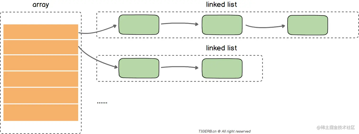 - 数组:数组里的值指向一个链表
