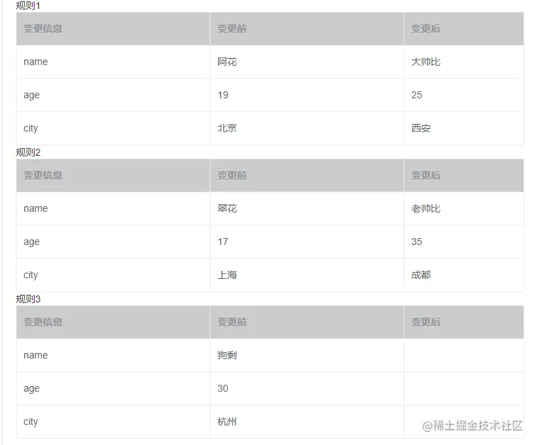 为什么这里选择用数组来作为返回值呢,其实想象一下就能明白,上面我们要求要用表格的形式展现出来,用数组可以方便渲染数据,同时数组的每一项都是一组变更,数组的长度就是变更的组数,这个我们后面会慢慢体现。