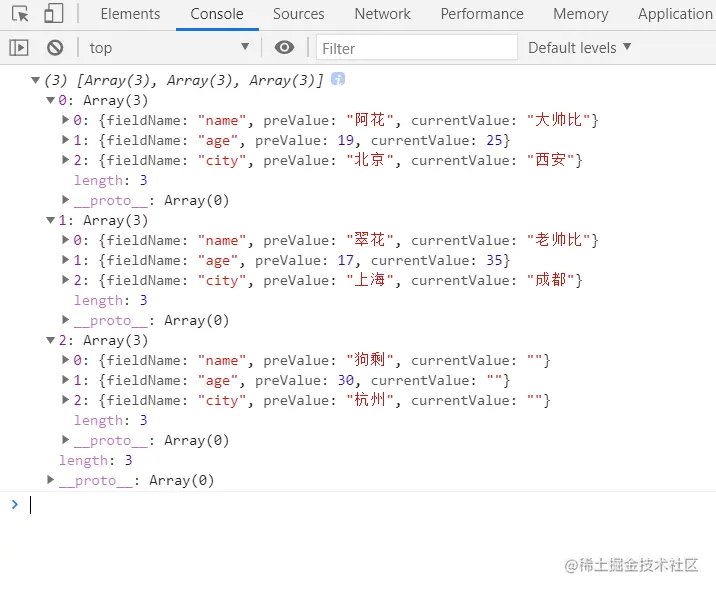 可以看到变更的值都检测到了,同时增加和删除也能检测到,这里我们把它设置为空了,不然会显示undefined