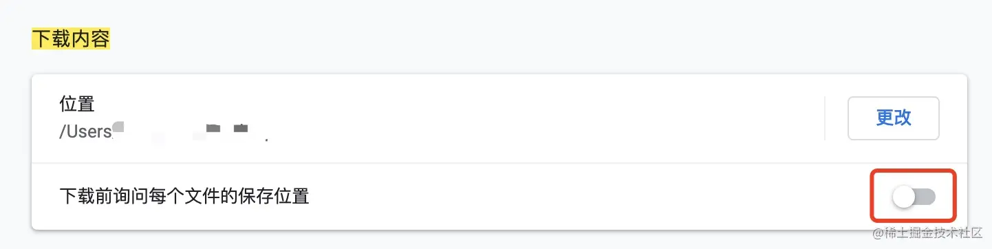打开 chrome 浏览器的设置,找到 下载内容这一项(或者直接在浏览器打开 chrome://settings/?search=%E4%B8%8B%E8%BD%BD%E5%86%85%E5%AE%B9),然后关闭 下载前询问每个文件的保存位置 的开关,这样在下载的时候,就不会弹出下载对话框了