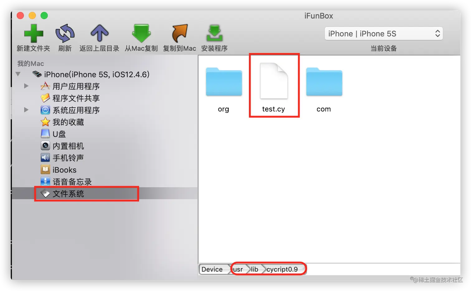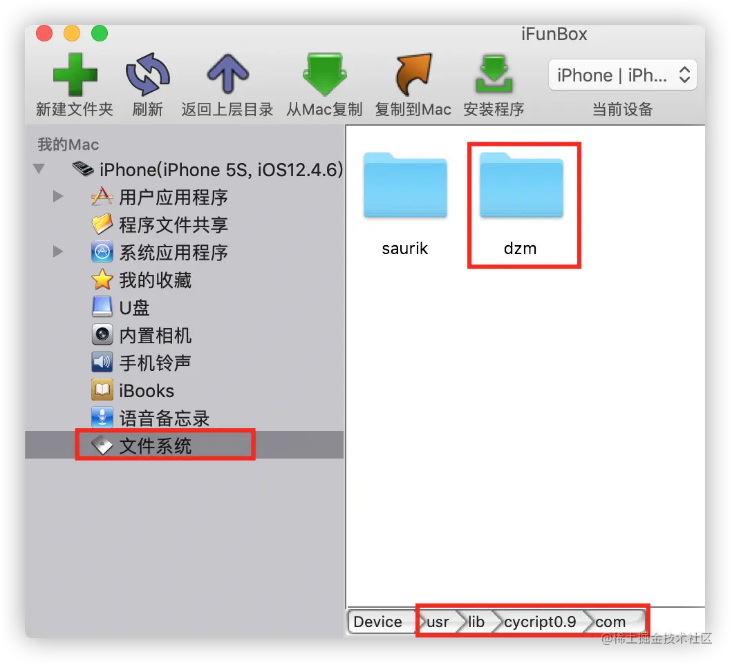Cycript在越狱的手机上就会有这个cycript文件夹,我们可以通过iFunBox查看,或者通过终端连接手机进行查看:iFunBox查看cycript文件夹