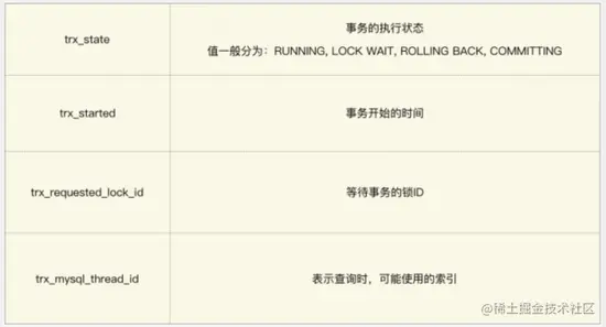 通过在命令行执行图中的语句,可以查看当前运行的事务情况,这里介绍几个查询结果中重要的参数: