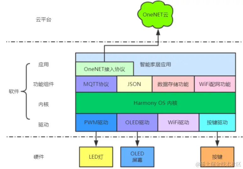 本系统硬件采用Hispark WiFi开发板,主控芯片为Hi3861,操作系统为Harmony OS,软件上支持MQTT、OneNET接入协议,驱动开发包括按键驱动、OLED驱动、PWD驱动开发,其它功能模块有NV数据存储、WiFi配网功能。
