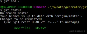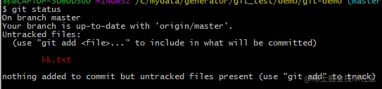 在工作区新建一个 kk.txt文件使用查看状态命令