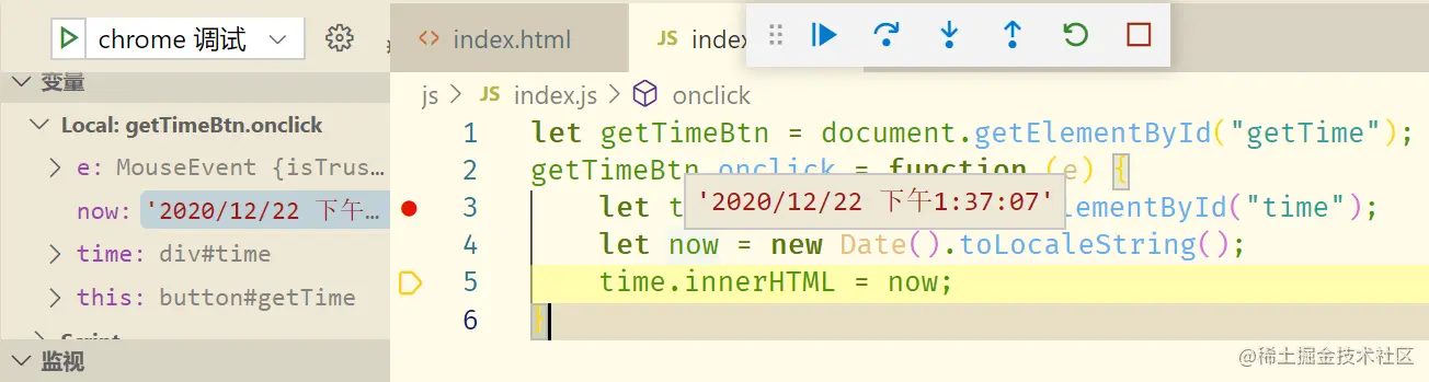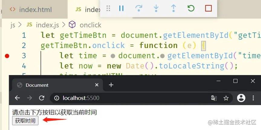 细心的你可能会发现,当点击一次 Go Live 按钮时会打开一个浏览器窗口,再点击一次调试按钮时(快捷键 F5),会打开第二个用于调试的窗口。这可能是没有必要的,我们只需要一个窗口就行了。