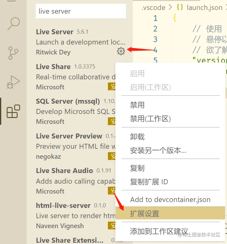 在扩展商店搜索 Live Server 并打开它的扩展设置: