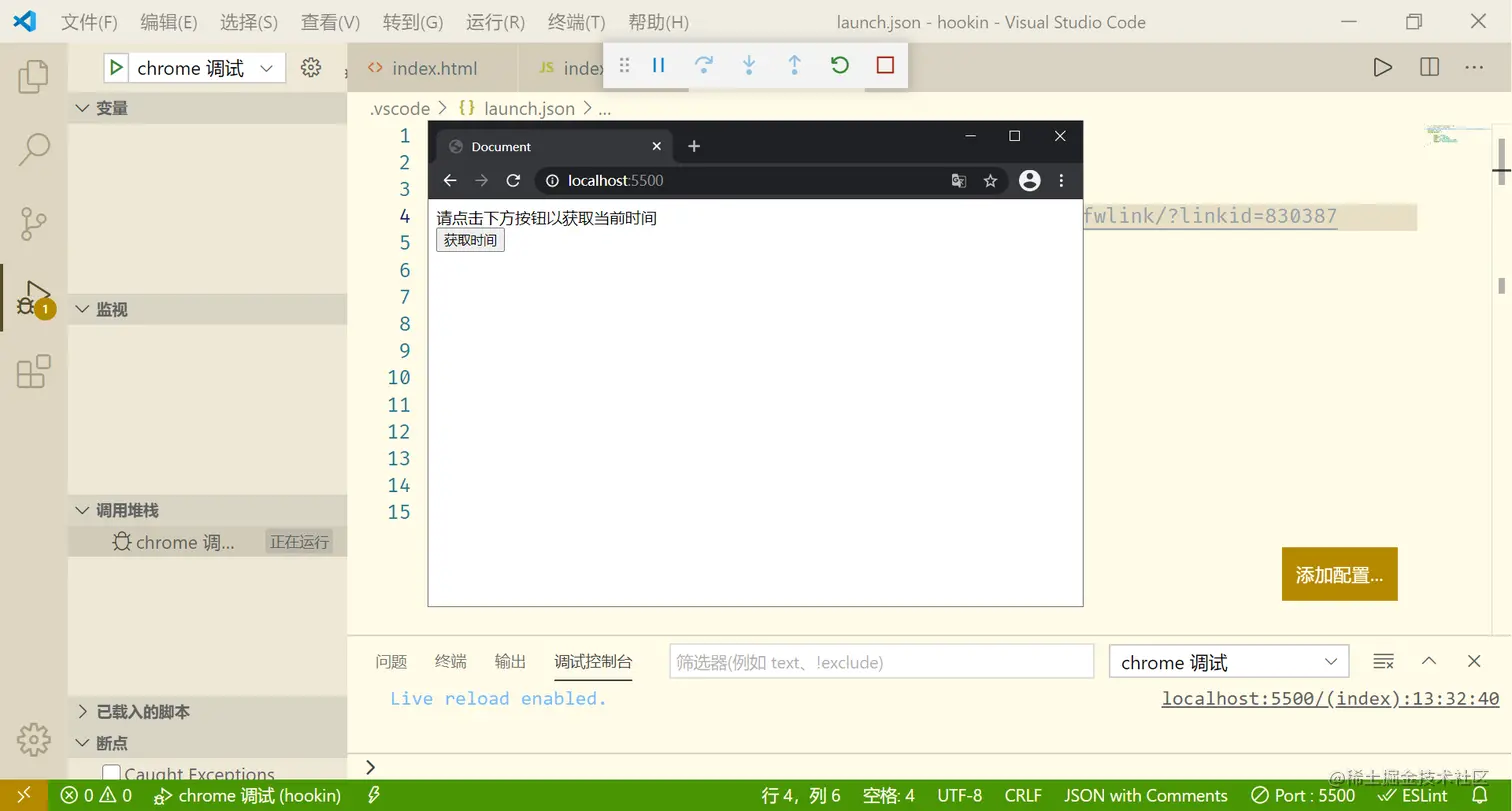 注意: "url" 字段中的端口号 5500 要与 Live Server 提供的端口号对应。