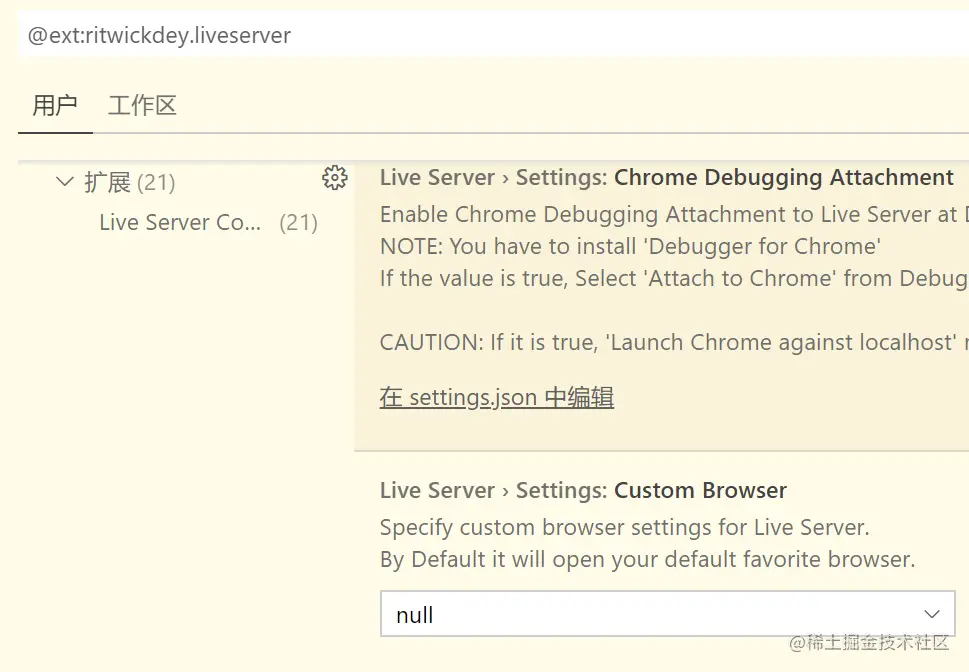 点击进入,将 "liveServer.settings.ChromeDebuggingAttachment": false 改为 true。