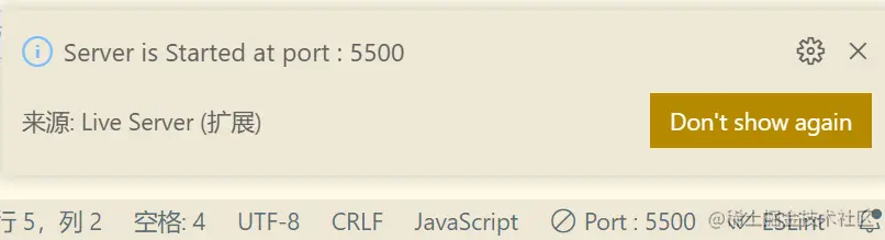请记住这个端口号:5500,因为后面会用到。当你多开 Live Srever 或其他程序占用了这个端口号时,端口号会自动 +1 。