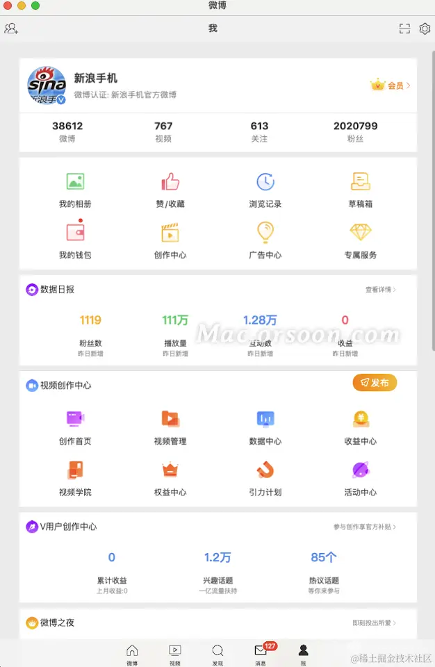 微博App原本没有Mac App,但是由于M1芯片的特殊性,让iOS和iPadOS上的应用可以在Mac上运行,所以我们也尝试了为iPad设计的微博App。