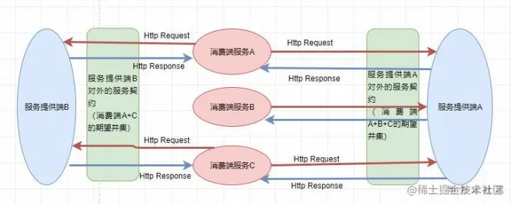 模型如下:消费端服务 A、B、C 调用访问服务提供端服务A,消费端服务 A、C服务提供端服务B。服务提供端会根据消费端期望分别生成1份契约文件,以满足消费端的诉求。