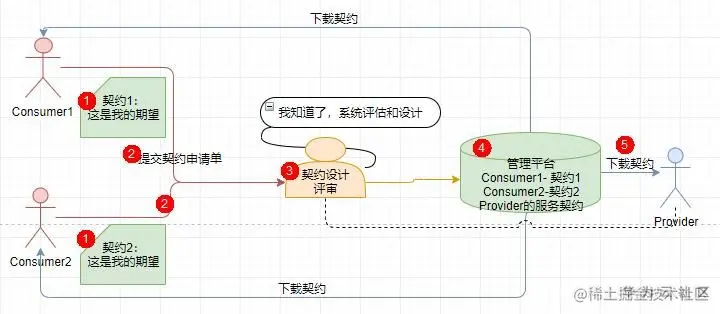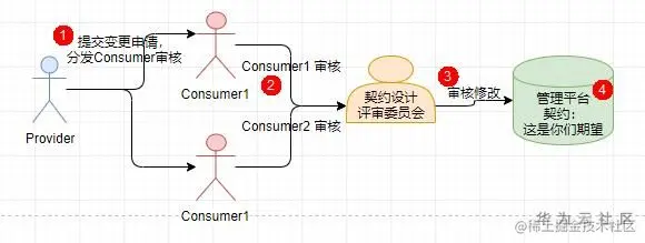 同时,如果服务端要主动变更契约,也要得到消费端和审视委员会的通过,审核通过合入后,消费者和服务提供者从契约管理平台下载契约使用。流程变得如下: