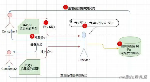 一般来说,是消费者(Consumer)把自己对输入和输出的数据结构、性能已经并发性等期望以约定的格式告诉服务提供者(Provider),服务提供者签署同意,这就形成了一份服务契约,服务提供者对所有消费者的契约取并集进行服务能力开发,形成自己服务的对外承诺或者schema。