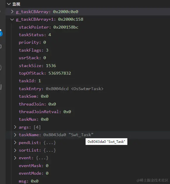 在调测时,在Watch监视器查看变量是非常有用的特性,也支持查看结构化的变量,比如监视g_taskCBArray变量,及下一个任务g_taskCBArray+1,如下图: