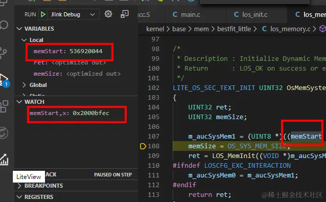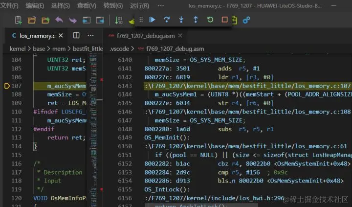 对于LiteOS开源工程,在调测时,默认开启了同时显示源代码和反汇编代码。如下图 当前函数执行到源代码的第107行,在反汇编文件中显示当前的源代码行数、源代码及对应的反汇编代码。调测时,提供了便利,不仅仅关注源代码同时关注反汇编代码。