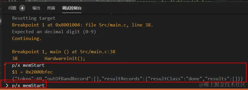 在调测过程中,变量的数值可能是10进制进行展示的,如果想查看其他进制展示的数值,可以在调测界面的监视器窗口输入变量名称名称+进制代码来切换进制查看,如memStart,x来查看变量memStart的16进制。如图: