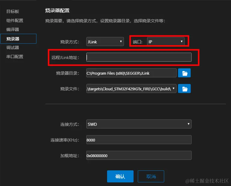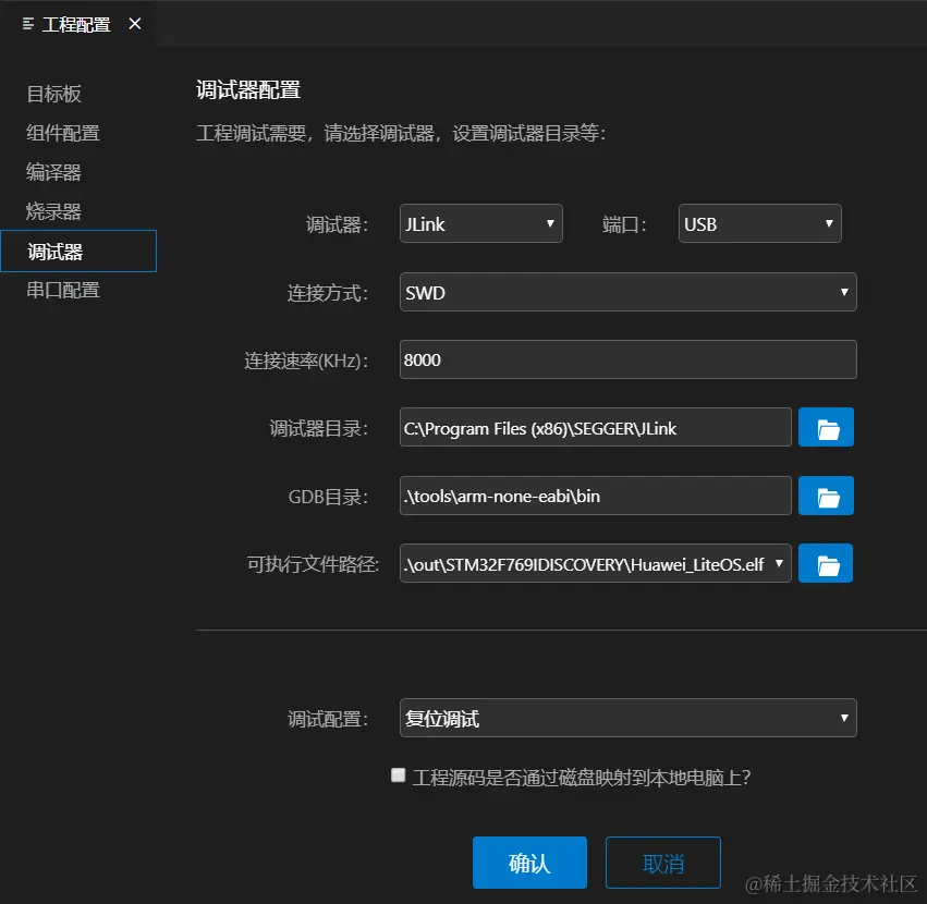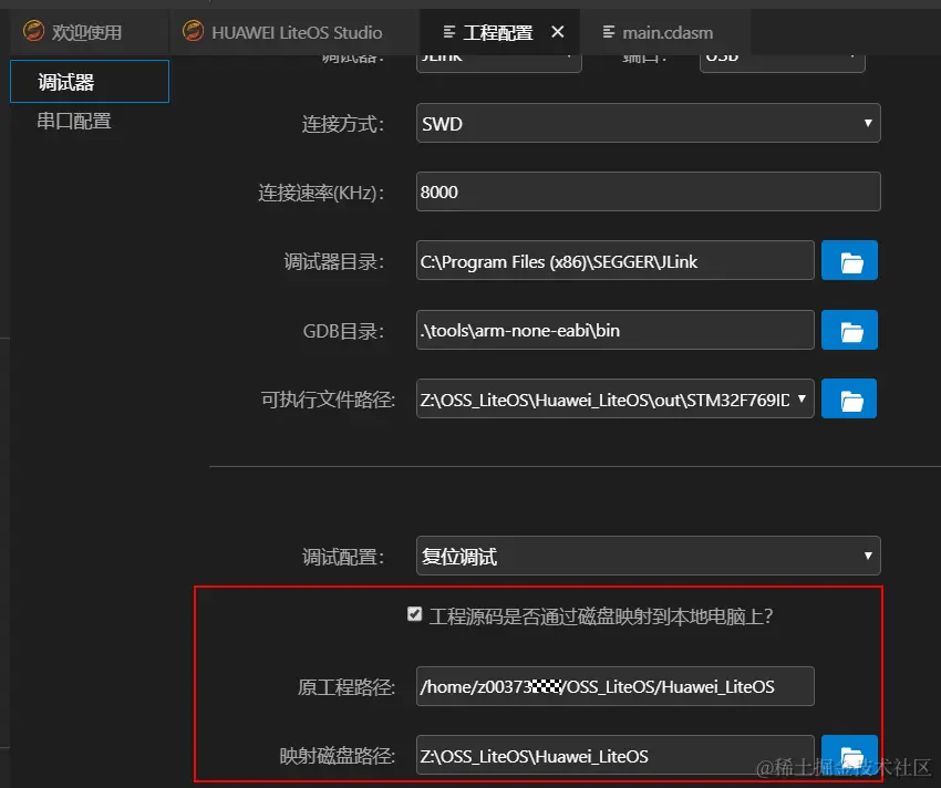 - 使用HUAWEI LiteOS Studio远程调试 同上,打开工程配置->调试器,选择JLink调试方式,选择端口为IP,并填入远程JLink地址,远程JLink地址填写远程服务器IPv4地址。