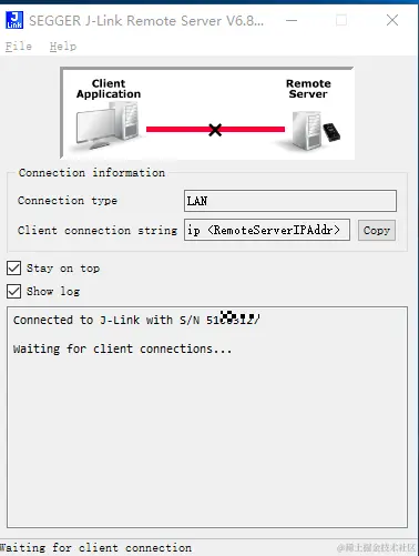 - 启动JLink远程服务器 在连接开发板的电脑上,在JLink安装目录下,手动启动JLinkRemoteServer.exe应用程序,进行如下设置,即可等待用户连入: