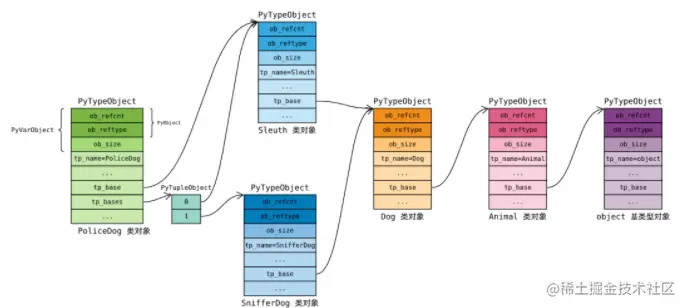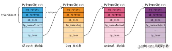 通过 tp_base 字段,子类与父类被串在一起,形成一条继承链: