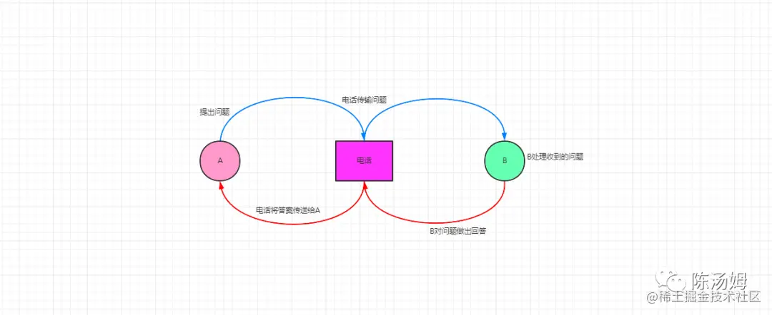 A首先给B打电话,电话接通后,A提出问题,B收到问题后思考得到答案后再通过电话告诉A,A得到了答案后挂断电话。