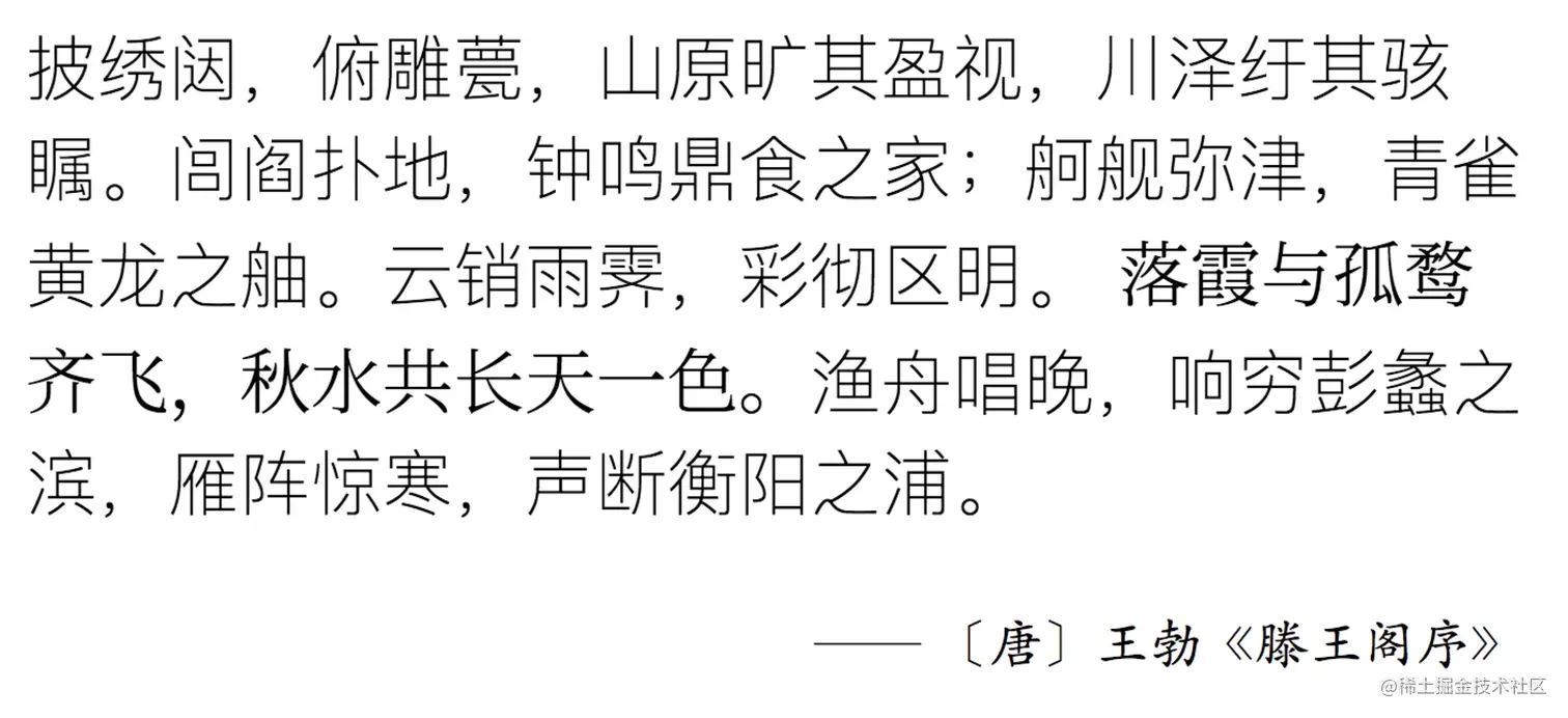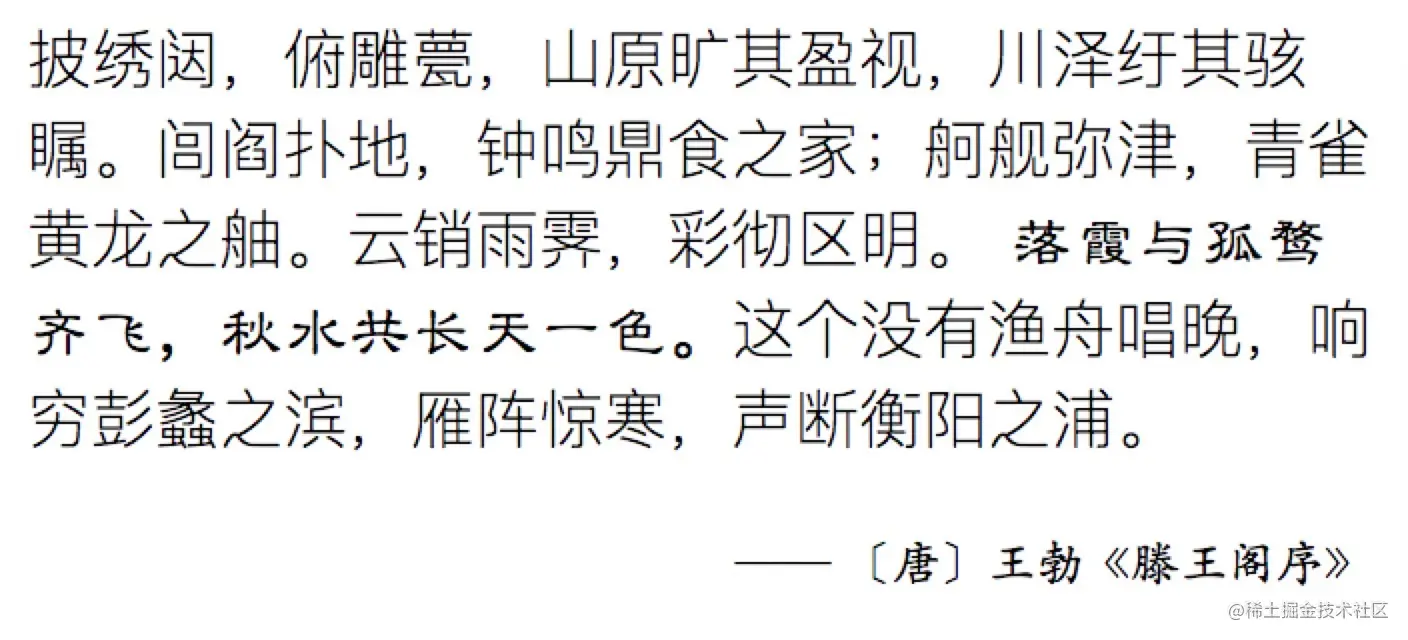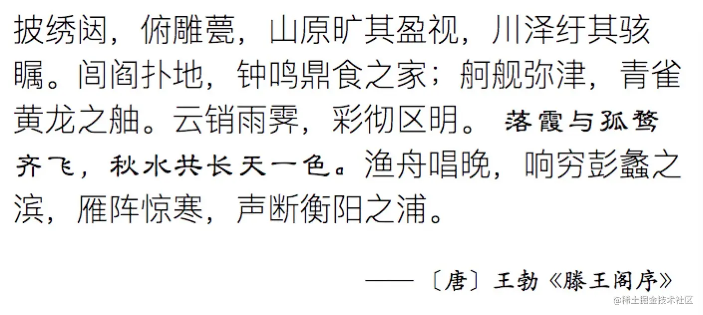 看一个中文字体的例子。假设我们要用特殊字体突出显示 “初唐四杰” 之一王勃的千古名篇《滕王阁序》中最有名的那句:“落霞与孤鹜齐飞,秋水共长天一色。”