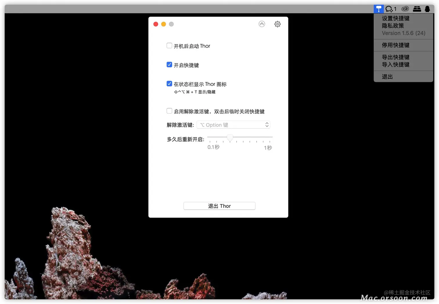 Thor 的使用非常简单,界面也很简洁,并且已经适配 macOS暗黑模式。安装软件后,打开它,点击菜单栏中的图标 - 设置快捷键,点击左下角的加号,添加应用程序文件夹中的 App,并对其设置快捷键即可。