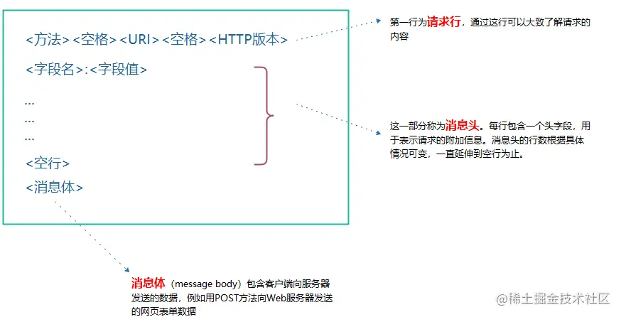 请求报文请求服务器对资源进行一些操作。请求报文的起始行,或称为请求行,包含了一个方法和一个请求的URL,这个方法描述了服务器应该执行的操作,请求URL描述了要对哪个资源执行这个方法。请求行中还包含了HTTP的版本,用来告知服务器,客户端使用的是哪种HTTP。