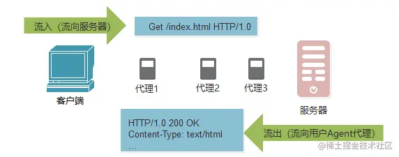 HTTP使用术语流入(inbound)和流出(outbound)来描述事务处理(transaction)的方向。报文流入源端服务器,工作完成后,会流回用户的Agent代理中。