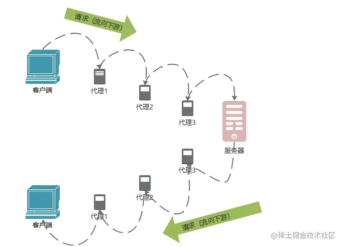 对于请求报文来说,代理1位于代理3的上游;但对于响应报文来说,它就位于代理3的下游。