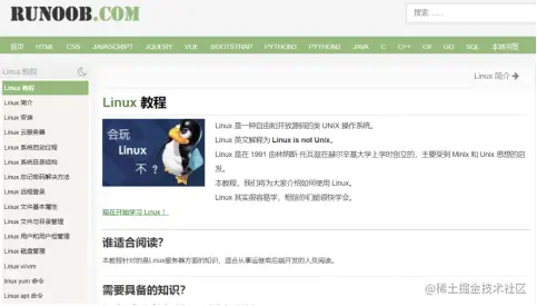 可以学习翻阅的资料有:菜鸟教程中《Linux 教程》www.runoob.com/linux/linux…