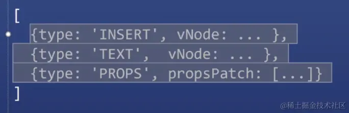diff是一个叫patch的函数,这个函数内部有一套逻辑用以层层比对新旧dom然后选择删除节点还是更新节点,这个函数会返回一个对象,这个对象如下,包含着一系列关于如何操作DOM的信息