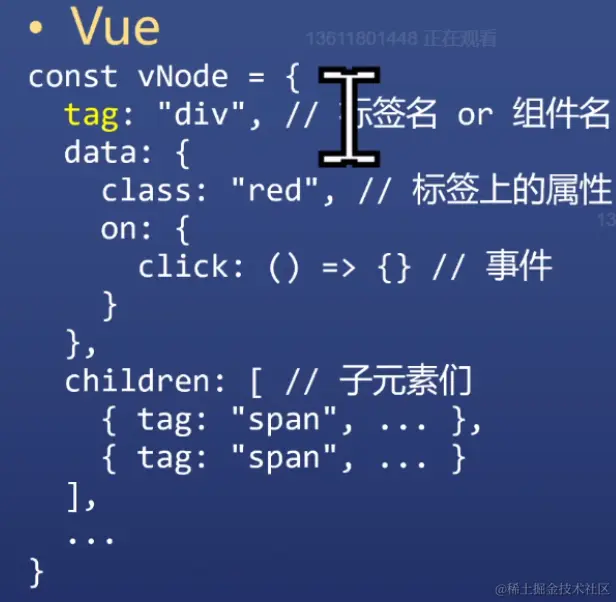 一个表示Dom树的JS对象,这个对象通常由标签名,子元素,属性,事件监听组成