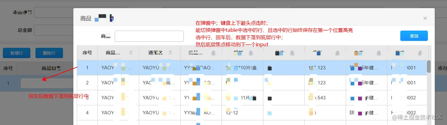 el-table中行中某一行中input回车(enter);会带出商品弹窗;通过上下箭头可控制弹窗中产品上下移动到视图、回车后数据落到底层table当前行中