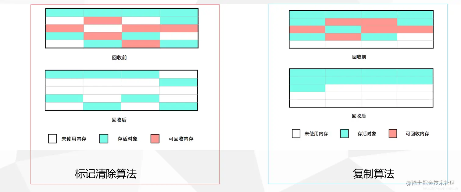 将活着的内存空间分为两块, 每次只使用其中一块, 在垃圾回收时将正在使用的内存中的存活对象复制到未被使用的内存块中, 之后清除正在使用的内存块中的所有对象, 交换两个内存的角色, 最后完成垃圾回收。