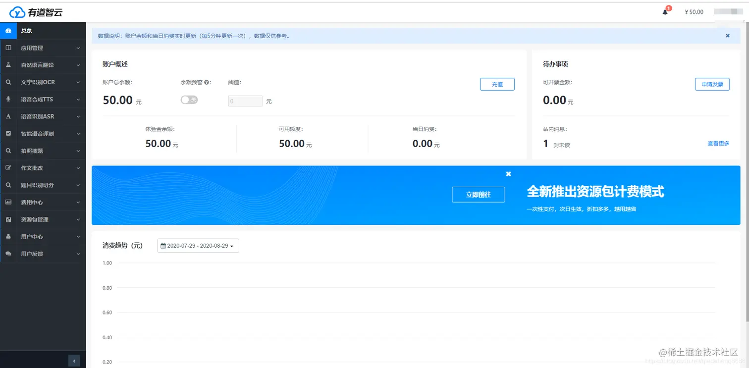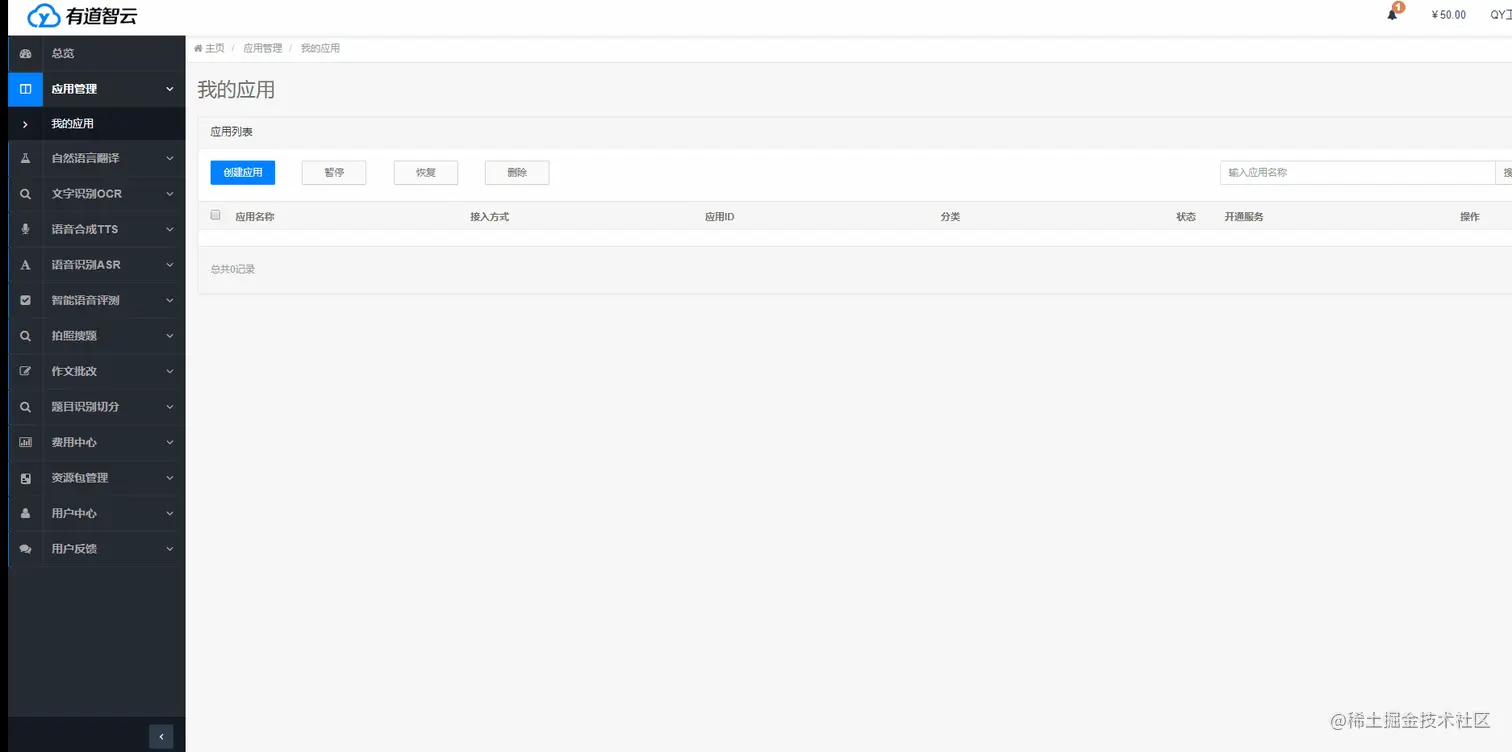 我这里用到的是自然语言翻译服务,首先,需要分别创建一个应用、创建一个自然语音翻译的实例;其次,需要将实例绑定到应用上。最后,就可以通过应用的应用 ID、应用密钥调用自然语音翻译 api 接口了。有道平台会对不同的实例、应用的使用情况进行记录、分析、收费。刚刚注册的体验者会有免费体验字数和 50 元的体验金哦(加客服貌似还会有额外的 50 元的)。