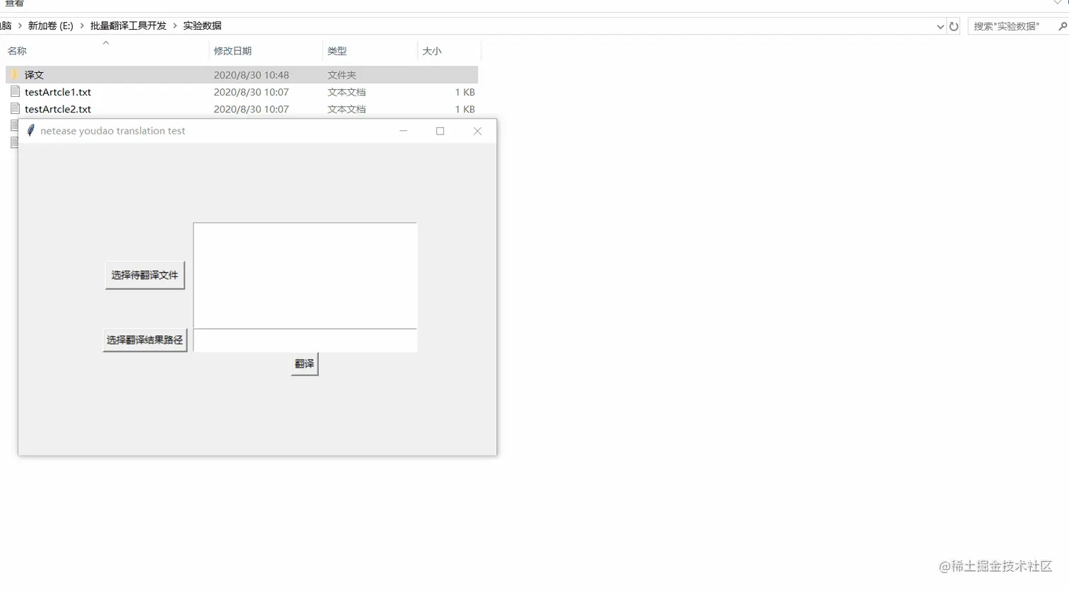 2)批量文档翻译开发 批量翻译 demo 使用 python3 实现,为了方便测试,我用 tkinter 做了简单的界面,用来读取待翻译文档,指定结果存储路径,为了最大化简化开发过程,降低测试的时间成本,目前只实现了读取. txt 类型文件的方法。