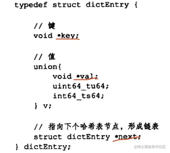 用dictEntry表示,每个dictEntry结构保存着一个键值对