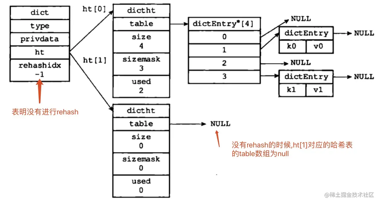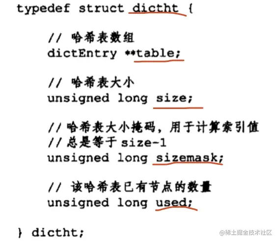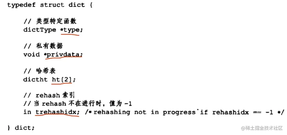 Redis 中采用字典dict又对哈希表进行了一层包装,dict的结构如下