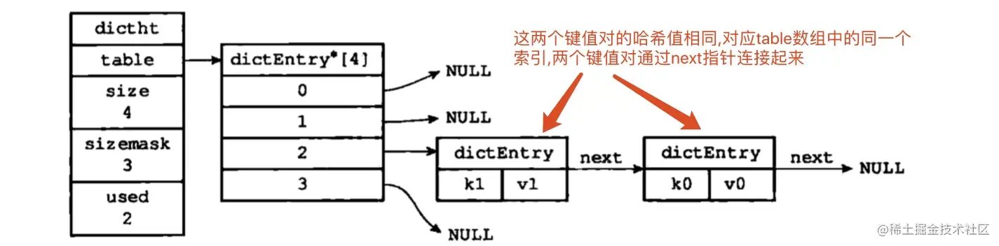 next属性是指向另一个哈希表节点的指针,利用指针可以将多个哈希值相同的键值对连接在一起,以此解决了键冲突的问题